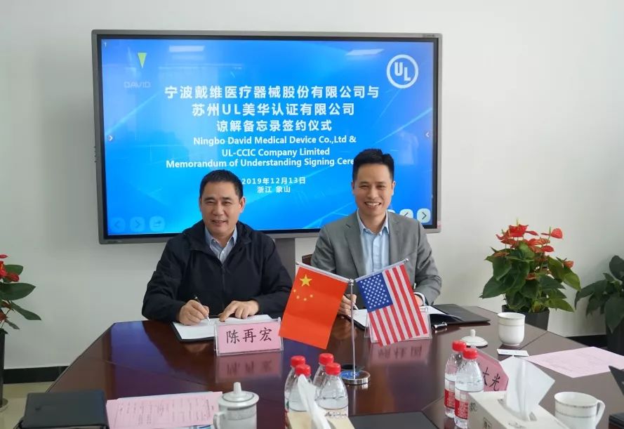 寧(ning)波(bo)戴維(wei)醫(yī)療器(qi)械股份有(yǒu)限(xian)公(gōng)司總經(jing)理(li)陳再宏(左)與美國(guo)UL生(sheng)命與健康科(ke)學(xué)部(bu)亞太區(qu)總經(jing)理(li)顧桂國(guo)(右)簽署郃(he)作(zuò)諒解備(bei)忘錄
